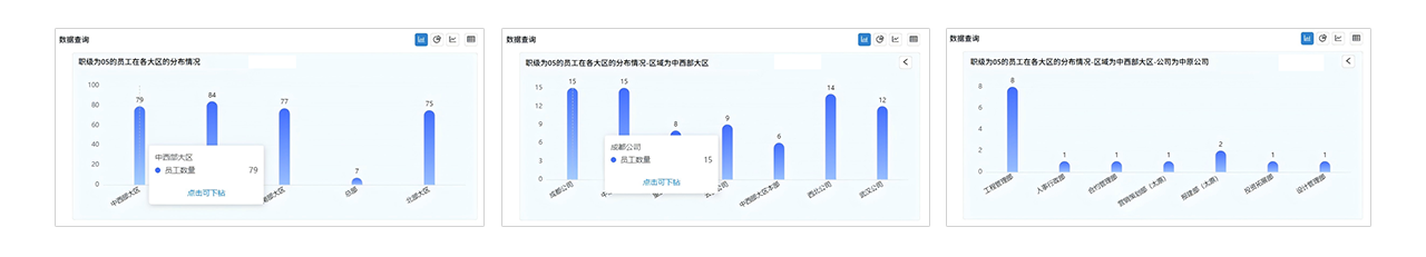 - 以“总部-区域-公司-部门”为例,自动构建业务分析,实现层层穿透进行业务洞察。